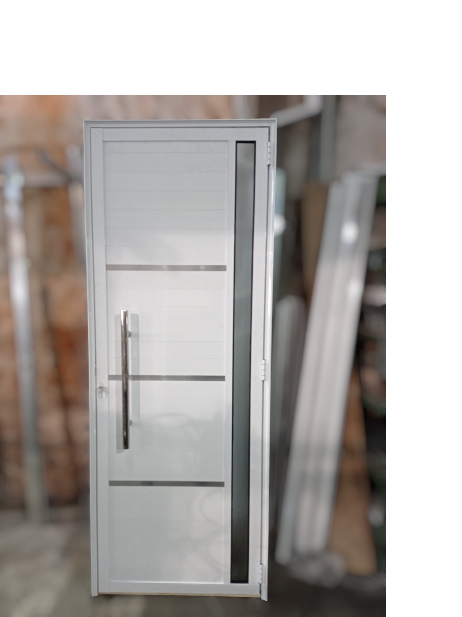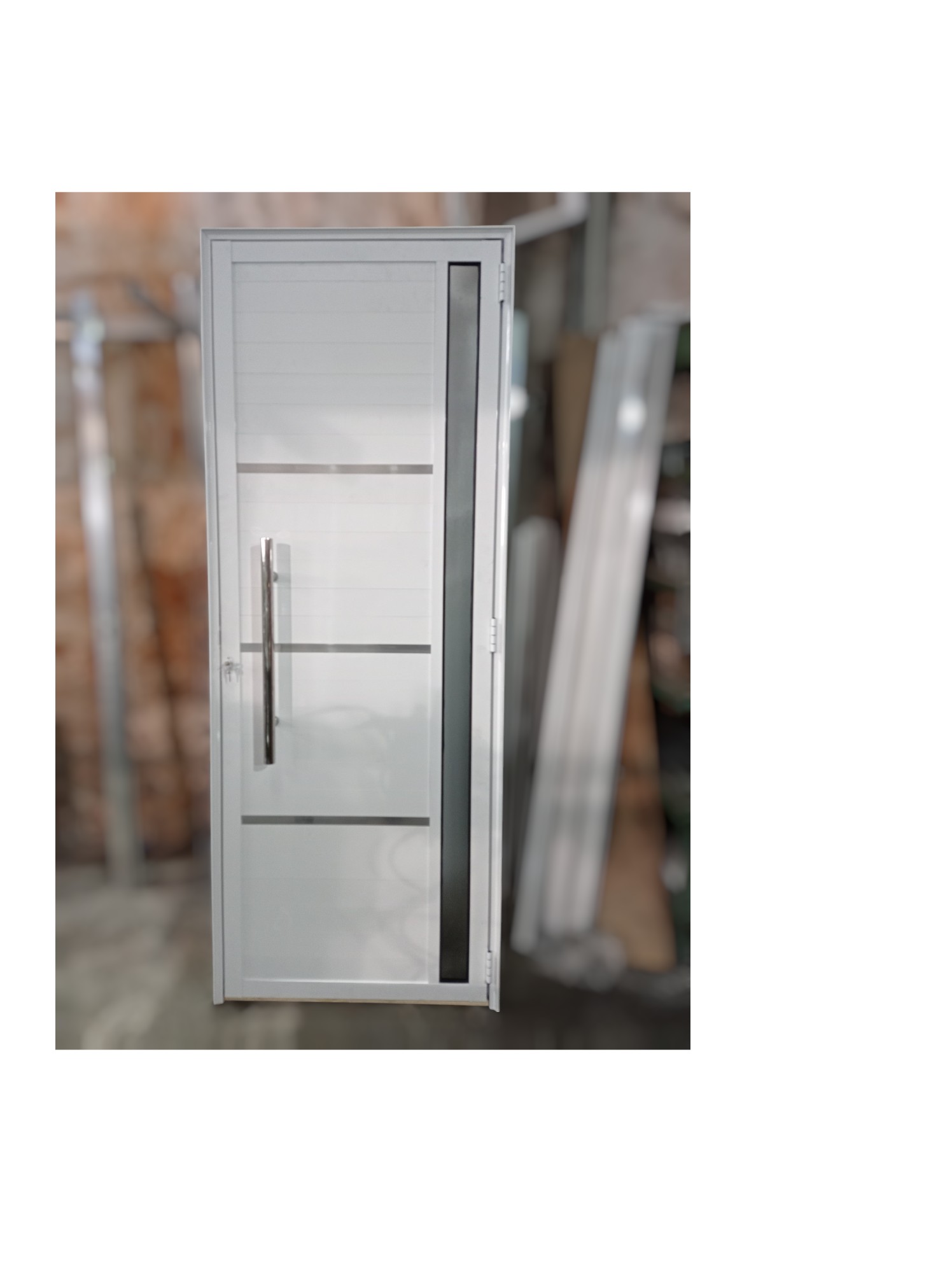 Porta Lambril de Alumínio 2,10×0,90 branca L25 com visor lateral e travessas brilhantes. Vidro miniboreal Puxador de inox 60cm. Fechadura rolete STAM